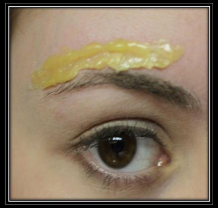 Take a small cloth strip and place it over the wax on your eyebrows before it dries out. Smooth the cloth strip in your eyebrow line using your finger tip.