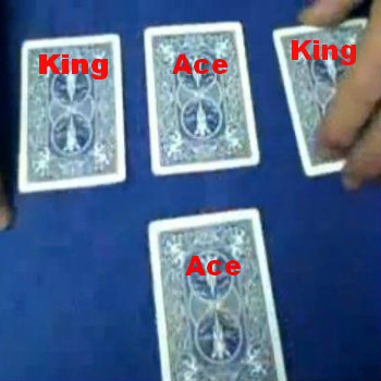 Arrange the above four cards such that you have an Ace at the top and one at the bottom while the Kings placed on either sides of the bottom Ace.