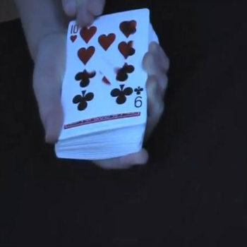 Hold the deck in your hands and start riffling it with the Ultra-gaff card and 9 of Clubs at the top. Tell the spectator to stop you wherever he likes as you riffle from top to bottom.