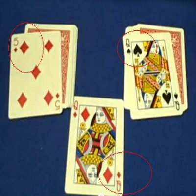 Now as you know the two top cards, make a prediction to the spectator by telling him that you have chosen Queen of Diamonds and you will come up with a Queen and a Diamond from a different suit.