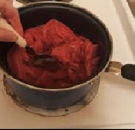 Now pour water in a pan and add some salt. Heat it until it starts bubbling. This will take a few minutes. When the water is boiled, pour the dyeing solution gently into the boiling water, avoiding the powder that has settled down at the bottom of the cup so that it does not pour with the solution. It is better to use a drainer while transferring the dying solution from the cup into the boiling water. Now when the dye is completely transferred into the boiling water, stir with a spatula until the solution is entirely distributed. Let it boil for 5-10 minutes.