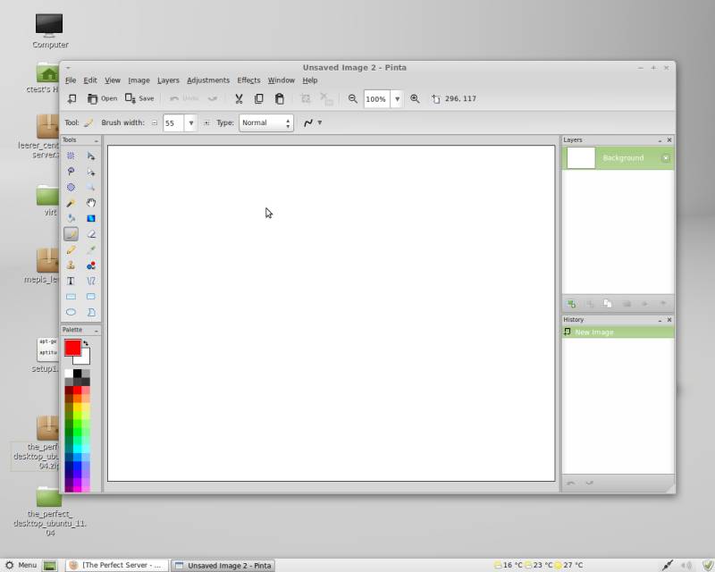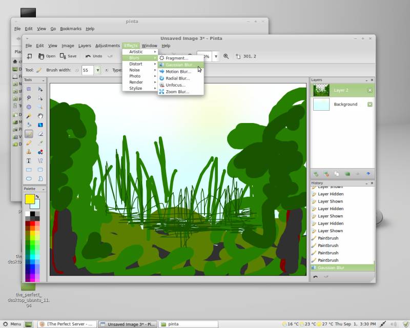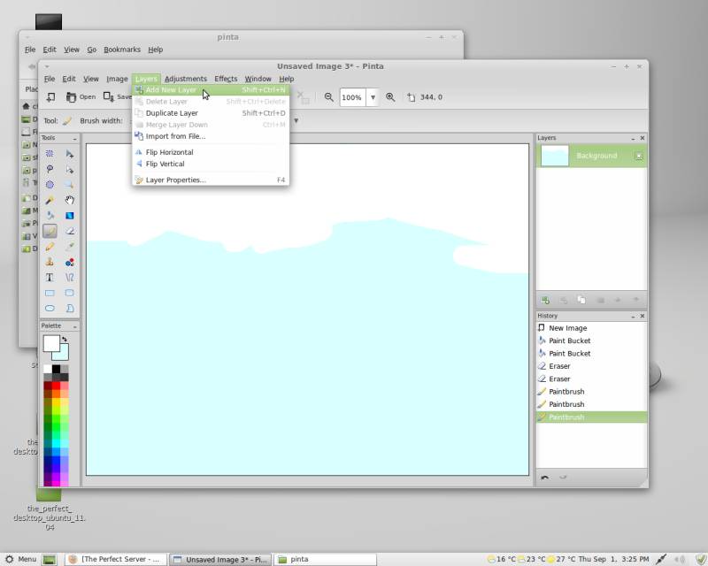 When you open Pinta, it emerges as a single window with a large central drawing panel. On the left side of the window, you will see a Tools and a Palette panel, while on the right side Layers and a History panel is located. On the upper part of the window, there are usual editing options. With the help of these options you can do several things like adjusting colors and brightness of the image. Moreover, you can add effects to your images.