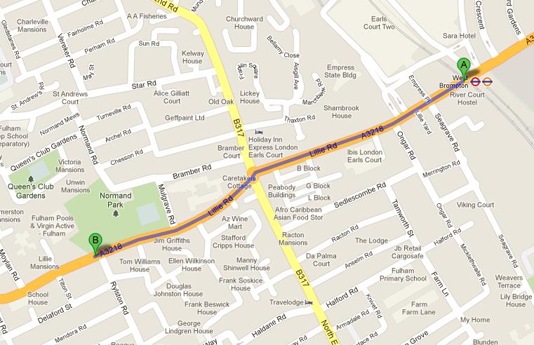 From the West Brompton tube station you need to move Southwest on the Lillie road to reach the Metroploitan Police Office at Empress state building. To have a look at the detailed route map, click Walking Directions.