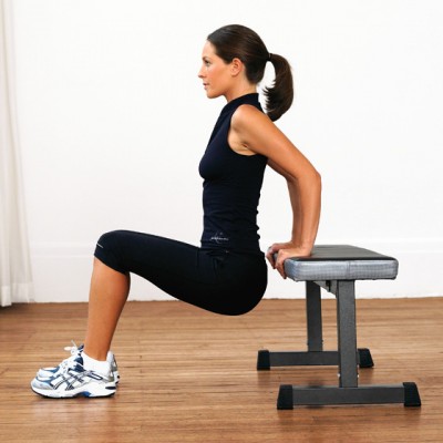 Also called Dips, this exercise just requires a bench or a chair. With the back to the chair, place your palms on it and start taking slow dips by bending your elbows.This places pressures on your triceps. Reduction in your triceps has a huge improvement on your figure.