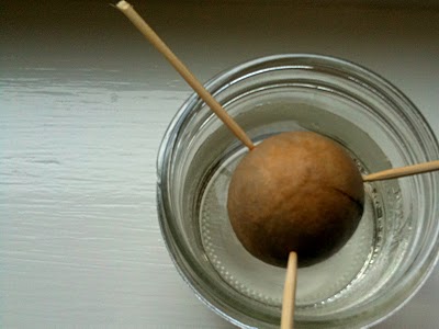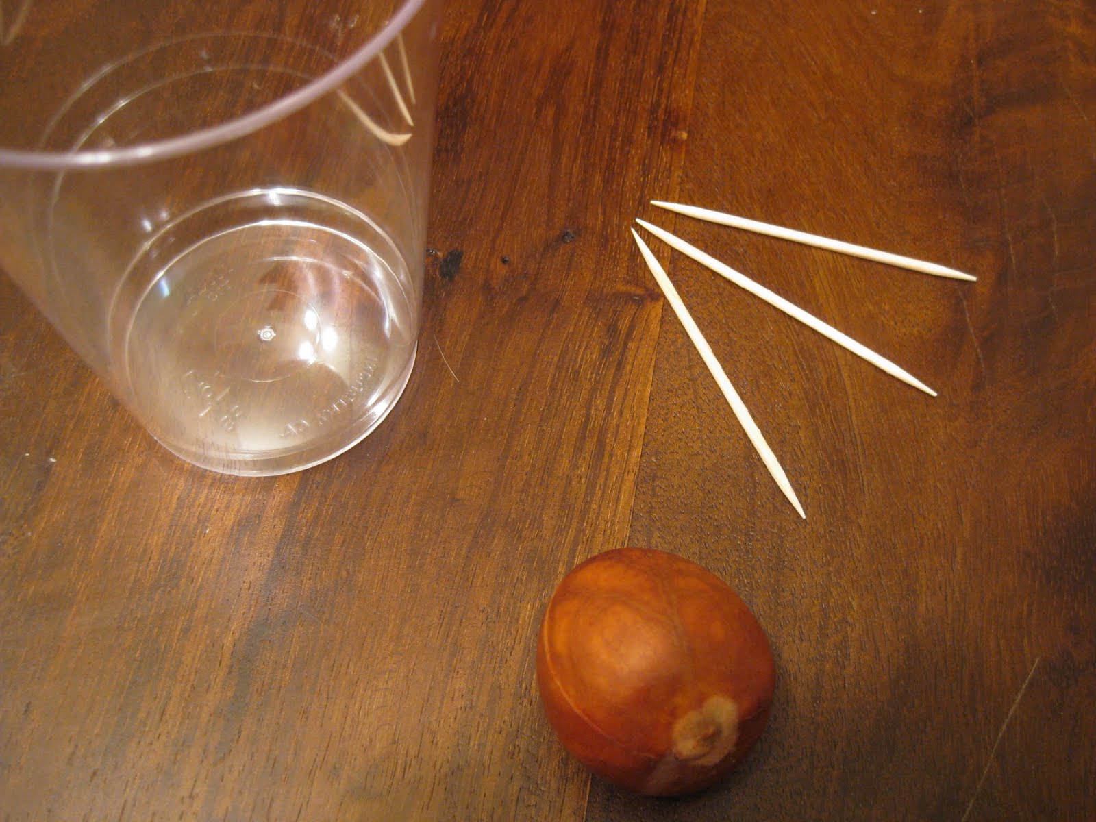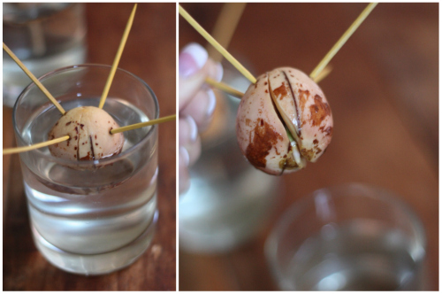 You will need a clear avocado pit along with 4 tooth picks and a half filled glass of water.