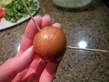 Now pick up toothpick in one hand and the seed in second and then stick it in it with the “pointy” side sticking upwards. You may also do that by angling your toothpick up so that it could dip below in water easily.