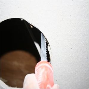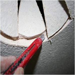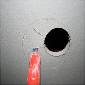 Use a sharp utility or putty knife to make a shallow-cut all around the round mark.