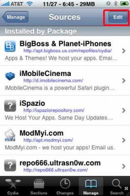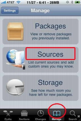 On your jail broken iPhone, tap on Cydia to launch it. You will see a list of options on the bottom of the app, tap on "Manage" and then tap on "Sources".