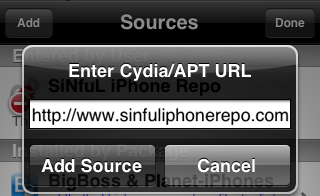 Now tap on "Add" button on the top left corner of the screen, you will see a text field to add address of the repository. In the text field without quotes write "http://www.sinfuliphonerepo.com" and then tap on "Add Source". you will see a warning tap on "Add anyway". then tap on "Done".