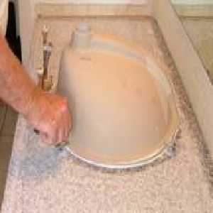 Start off by cleaning your cabinet, removing any dust. Lay down the vanity top with its polished surface down on the cabinet. Level it from the front and the sides. Use shims to maintain level if needed. Do a trial fit to check if the measurements are correct. Then place the sink bottoms up in the sink hole. Ensure that the edges are all aligned. Make sure that the sink holes are fully covered and check with your fingers if a uniform edge forms around the sink.