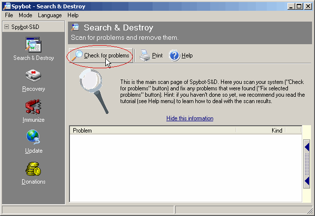 Run Spybot. You will see a ‘Check for Problems’ button in the interface. Go ahead and click that button to start a thorough computer scan for spyware. As the scan progresses, Spybot will start making a list of spywares found on your computer. Do not grow impatient if the scan seems to be taking a long time.