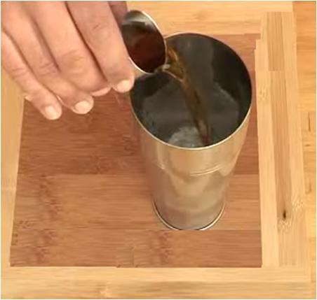 Now, gently add 2 fl oz (50 ml) of dark rum, 1 fl oz (30 ml) of fresh lemon juice and ½ teaspoon of fine quality grenadine to the chilled cocktail shaker.