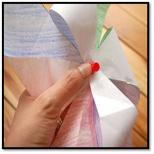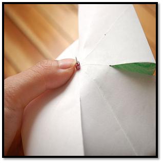 Now carefully scooty your finger slightly to the side and gently push the pin through the middle of the four over-lapping edges of the paper so that all of the fit snugly on the top of one another beneath the pin.