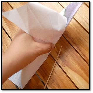 Insert a small bead onto the underside of the inserted pin, forming the part that allows the wind wheel to spin between the stick and the paper.