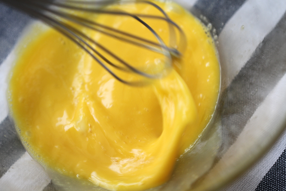 Now, take a medium-sized bowl, and add in the beaten eggs, light cream, salt, white sugar and cayenne pepper. Whisk it all together, until everything is thoroughly incorporated, and then pour this into the pastry shell, over the bacon, onions, and cheese.