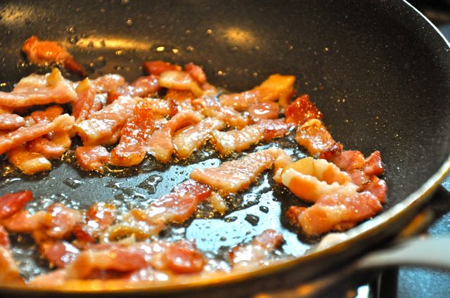 Begin by preparing your bacon. Place a large skillet on the stove over medium heat, and fry up the strips of bacon until they are brown and crisp. Drain these on paper towels, and then chop them up coarsely.