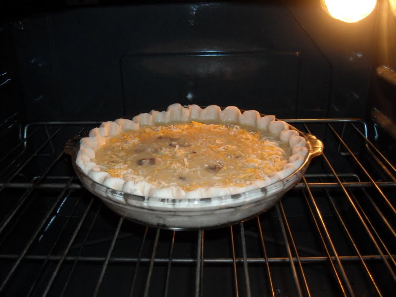 Fit your pastry into your pie pan. Then, mix the bacon bits, the onions, and the shredded cheese together, and then sprinkle these into the base of your pastry shell.
