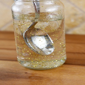 Fill your bottle with distilled water and add the glitter to it. Use the glitter generously. Add some glycerin because it makes the glitter settles down slower than water and creates that slow motion effect.