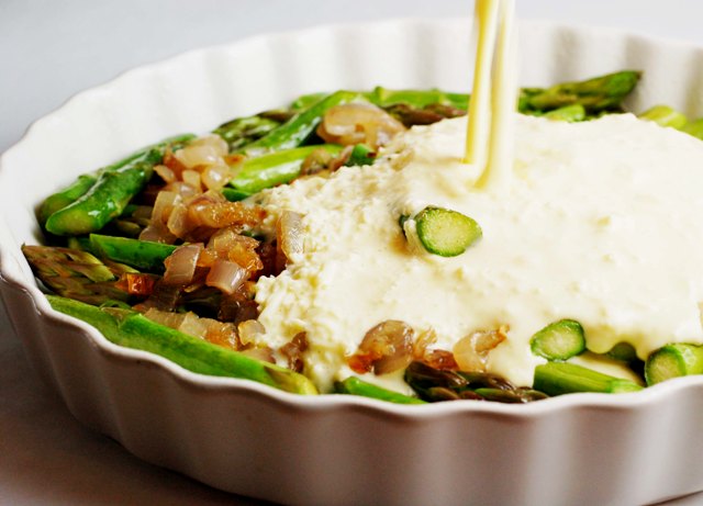 You are now ready to begin assembling your quiche. First, spread all your spinach on to the very bottom of the pie crust, and top it with a layer of the chopped bacon, green onion, and Cheddar cheese. Then, pour the egg mixture over it all, and top it off evenly with the grated Parmesan cheese.