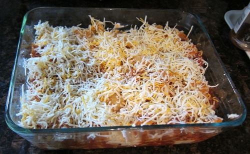 While the sauce is simmering, preheat the oven to 350 degrees F (175 degrees C), and prepare a 9x13 inch baking dish by greasing it lightly. Once the sauce is done and the pasta is boiled, you are ready to begin assembling the dish.