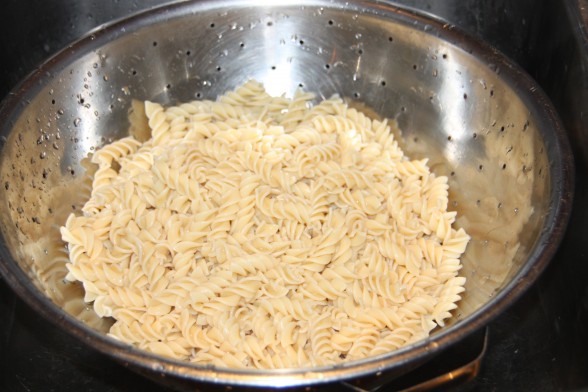 Use a colander to drain the pasta, and run it gently under cold water. Toss it a little to shake out any excess water, and then set this aside.