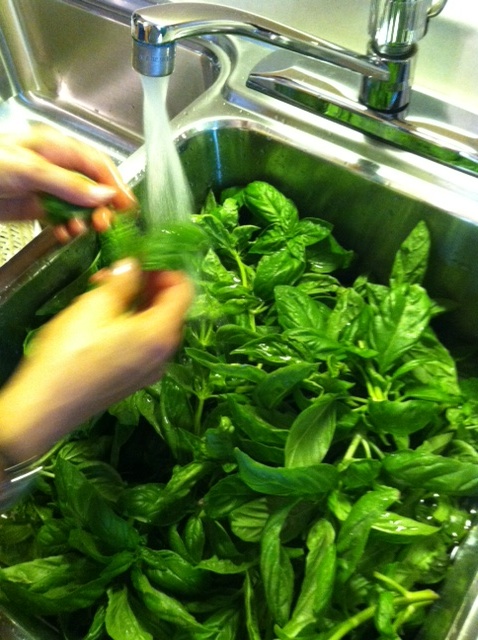 Next, clean the basil thoroughly, to rid it of any dirt or soil leftover from the garden. Basil is best cleaned by holding it under running water to rinse the leaves – soaking it makes the leaves too limp and soggy to handle. Once you’ve washed the leaves thoroughly, pat them dry with a towel.