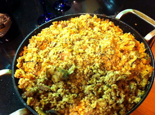 While the clams are steaming away, combine the diced salami, diced sun-dried tomatoes, breadcrumbs, butter, and lemon juice in a bowl - your stuffing is now ready. Put this aside to use later.