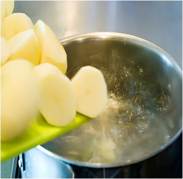 Utensils: Pot, knife, colander, cutting board, potato masher