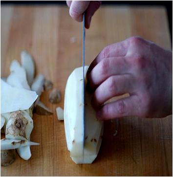 Set the peeled potatoes on a cutting board and cut them into length-wise quarters.