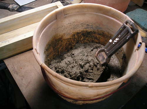 Prepare the mortar in a bowl or on a piece of plywood mixing equal amount of sand and cement with water. Using the trowel thoroughly blend the mixture.