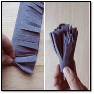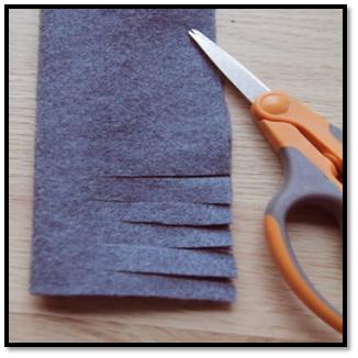 Fold the felt fabric in half lengthwise and carefully cut it on the unfolded side in even strips. Cut narrow strips for small Fringed Felt Flowers and wide strips for large flowers. Leave some space at the folded end of the fabric as you cannot cut it to the end.