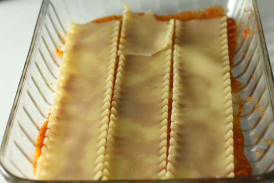 Now, you are ready to begin assembling and layering the lasagna. Take a standard lasagna pan, and at the very bottom, spread the reserved cup of marinara sauce thinly and evenly. Then, layer on some lasagna noodles, lengthwise – it’s alright if they overlap.