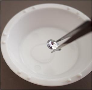 Grab a disposable plate and pour some shoe glue into it. Pick one of the large rhinestones (10 to 15 mm) with the help of tweezers and dip its flat back into the shoe glue in the plate.