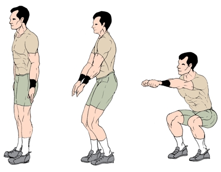 Keep your hands on your sides while you stand with your feet shoulder-width apart. Raise your arms to your shoulder level while you act as if you are sitting on a chair, slowly lowering your buttocks. During this keep your posture upright. Keep your knees behind the toes. Slowly get up while you lower your arms. You can do 20 squats in a set and do three sets each day.