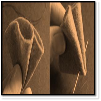 Fold the same circle in half one more time and use a threaded needle to sew and secure the tip area of the folded felt fabric, as shown in the image. Go through all layers of felt in order to secure the petals thoroughly.