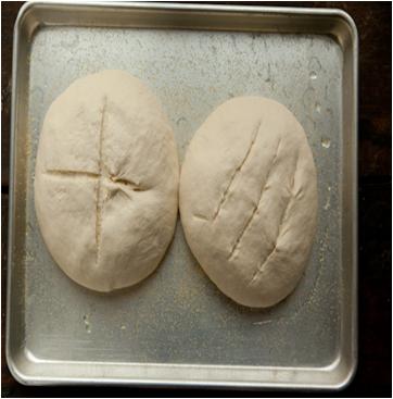 Remove the plastic wrapping sheet after one to two hours and make some designs on the top of the dough loaves, using knife.