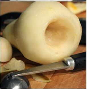Cut or scoop out the cores of the pears, using a paring knife, an apple corer, spoon, or melon baler.