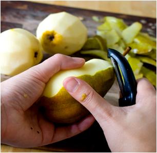 In the mean time, grab a knife and peel the 10 pears properly, without removing their stem.