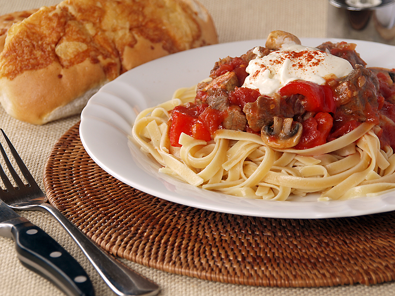 Once the beef becomes tender, you will know the goulash is done. Take the Dutch oven off the heat, and wait for the stew to stop bubbling. Then, stir in the sour cream, taste to check for seasonings, and finally, serve over hot buttered noodles, with a generous sprinkling of fresh chopped parsley and an additional dollop of sour cream.