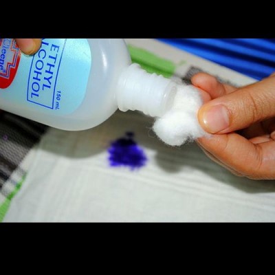 If the stain does not go away with the hairspray method, try a different technique. Use rubbing alcohol as the cleaning material. Take a cotton ball and completely soak it in the rubbing alcohol. Gently rub the stain with the alcohol soaked cotton ball.