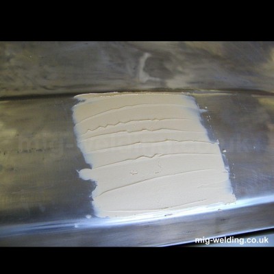 Now prepare the body filler. Mix the hardener to the base filler using a rigid plastic spreader on a flat surface. Remember to read the instructions listed on the can. Also, once the body filler is ready, you have little working time because it will harden very quickly, so you will have to work fast from here on.