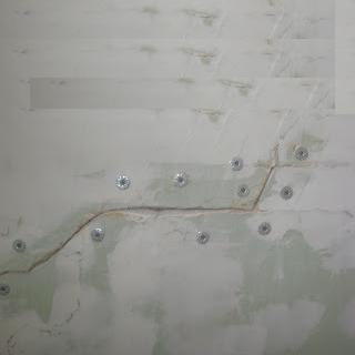 Now we attend to large cracks in the plaster. On both sides of the crack, install screws approximately 6 inches apart from each other and about 1 inch away from the crack. As before, cover the area with joint compound.