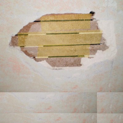 Now you need to attend to areas where the plaster is missing altogether. Fill small holes with joint compound to with 1/8 inch of the surface. Use a 6-inch spackle knife for the job. To make sure the compound stays in the hole, scratch it in a crisscross pattern using the edge of the spackle knife and leave the compound to dry. After it dries, apply another coat of joint compound to level the surface.