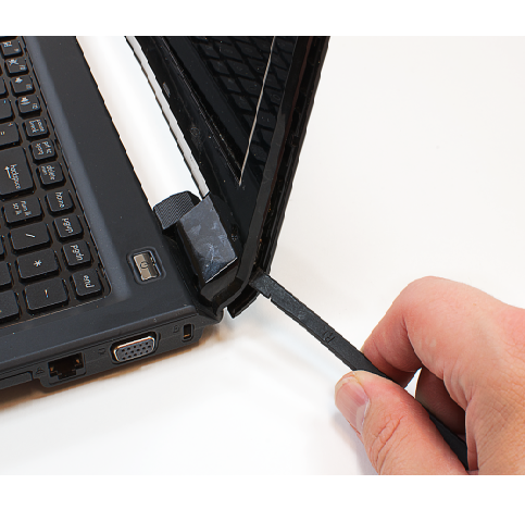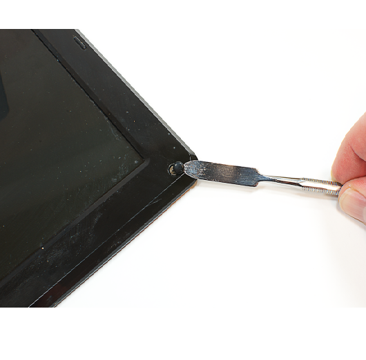 After having tools set, next step is to open the screen. First of all you need to remove the bezel covering the screws. You can look in the below picture that rubber cushion is hiding the screw that is holding bezel to keep it in place. You have to remove all such cushions to get to the screws under them.