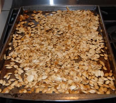 After 30 minutes have elapsed, you can check to see if they are cooked and golden brown, or bake them for another 15 minutes until they are done. Finally, take the seeds out of the oven once they are done. Spread them out on a tray lined with paper towels to cool them, and serve.