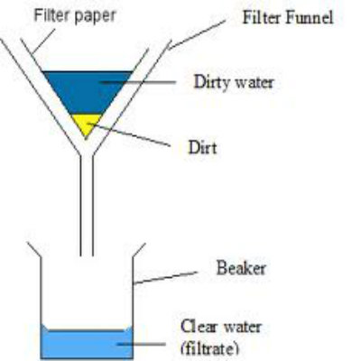 Put a funnel into a beaker and fix paper over the funnel. Pour in all the sand and water mixture slowly. You will see that water distills inside the beaker and the sand is left at the surface of the filter paper.