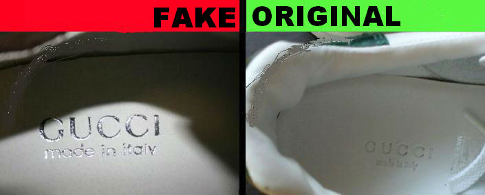 Make sure that there will be words like “Gucci Made in Italy" on the heel of the shoe lining, inside all real Gucci shoes lined with leather. However it could be outside of the sole just above the shoe size for a genuine women's Gucci shoe.