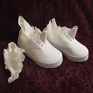 Apply baby powder on the whole shoe or its parts like tongue, sole, laces etc. while applying the powder to the soul, lift it up and sprinkle the powder, then put it back on.