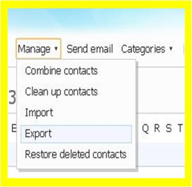 Once your Hotmail Contact List is opened, just click the drop down arrow on the right side of the "Manage" link that you can find between “Delete” and “Send Email” links.