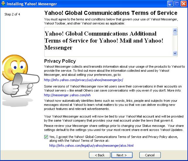 Go through the terms and conditions for downloading the latest version of Yahoo! Messenger and click the small white square box on the left side of “Yes I accept the Yahoo global communication terms of service and privacy policy above.”